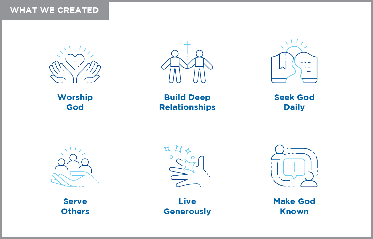 For the all-church rollout in fall 2024, we developed a comprehensive communication plan. We expanded our messaging through booklets, detailed artwork, apparel, and other materials, transforming abstract ideas into tangible expressions of our vision.